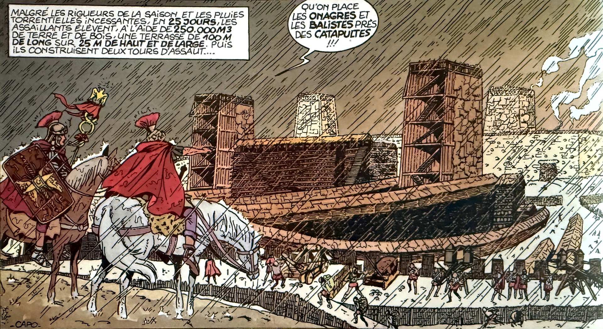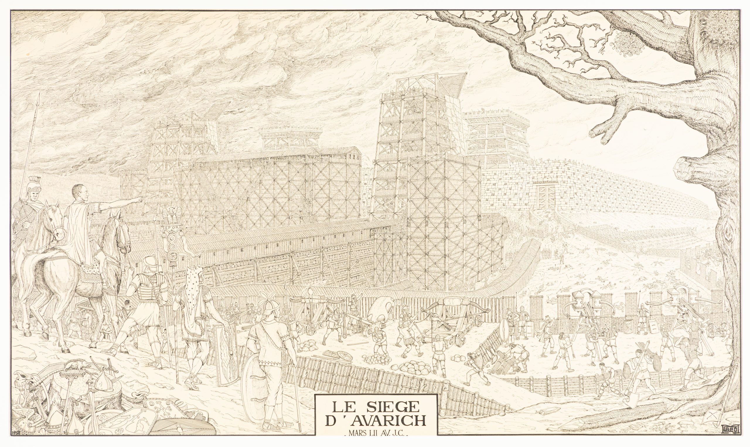 À travers ces deux représentations du siège d’Avaricum, une même histoire se transmet de génération en génération. En 1958, Michel Capo livre sa vision de cet épisode majeur de l’histoire de Bourges dans un dessin à l’encre de Chine. Près de soixante-dix ans plus tard, son fils Bernard Capo s’inspire du travail et de la représentation réalisée par son père pour concevoir sa propre planche dans l’album Les Grandes Heures de Bourges. Deux regards, deux époques, mais un même attachement à la mémoire de la cité berruyère, dans une filiation artistique où l’histoire et le geste se transmettent de père en fils.
