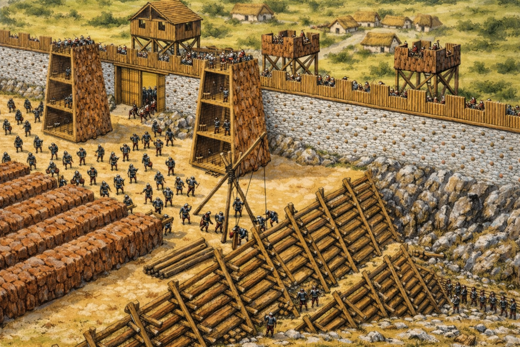 Protégée par un puissant rempart de pierre et de bois, Avaricum est un oppidum organisé, doté de rues, de places et d’une position naturelle difficile à attaquer.