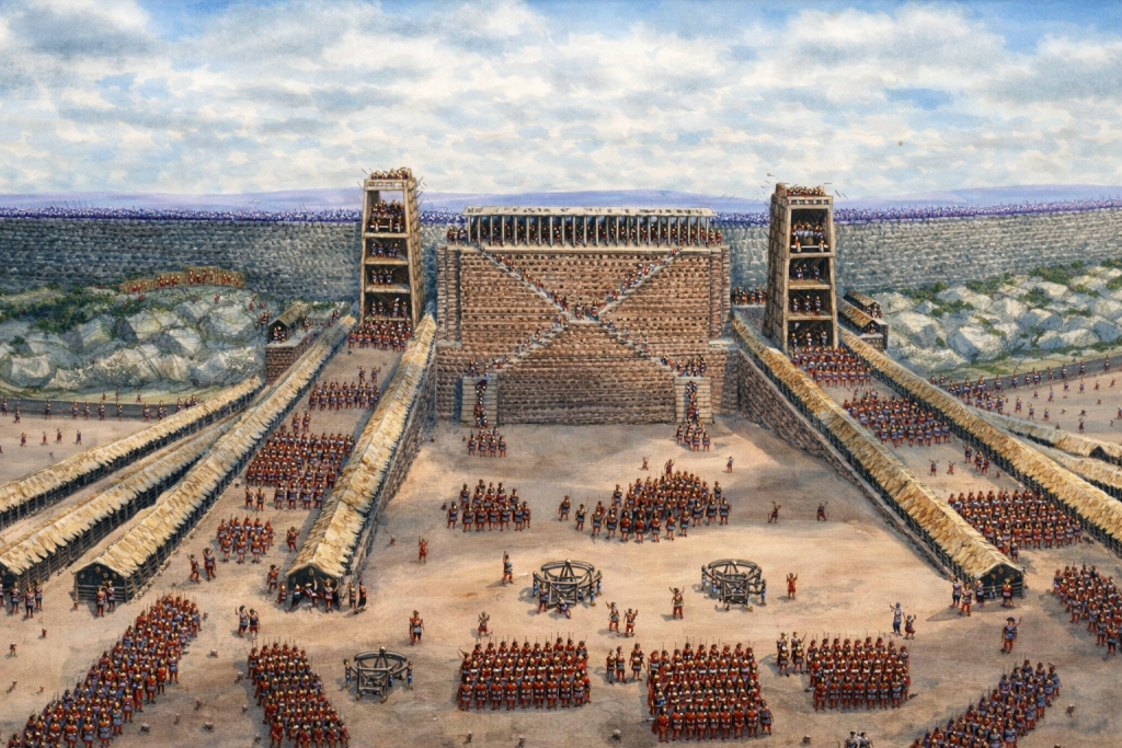 Camp militaire romain. Les légions établissaient des camps fortifiés organisés selon un plan précis pour protéger les soldats et organiser les opérations de siège.