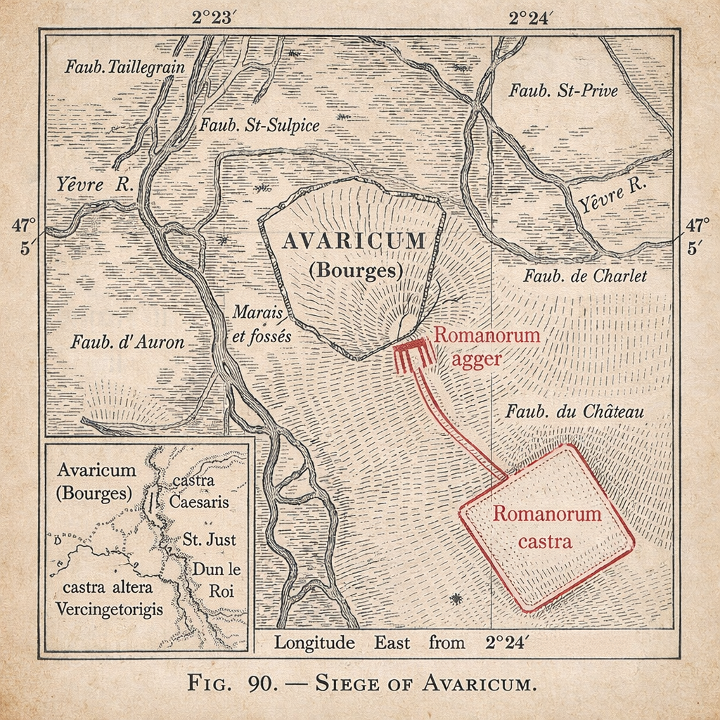 En 52 avant Jésus-Christ, dans le contexte de la grande révolte gauloise menée par Vercingétorix, Avaricum devient l’un des principaux objectifs des légions romaines. Le chef arverne préconise alors une stratégie de la terre brûlée afin d’empêcher les Romains de se ravitailler. Pourtant, les habitants d’Avaricum refusent d’abandonner leur cité. Confiants dans la solidité de leurs remparts et dans la protection offerte par les marécages environnants, ils choisissent de résister.